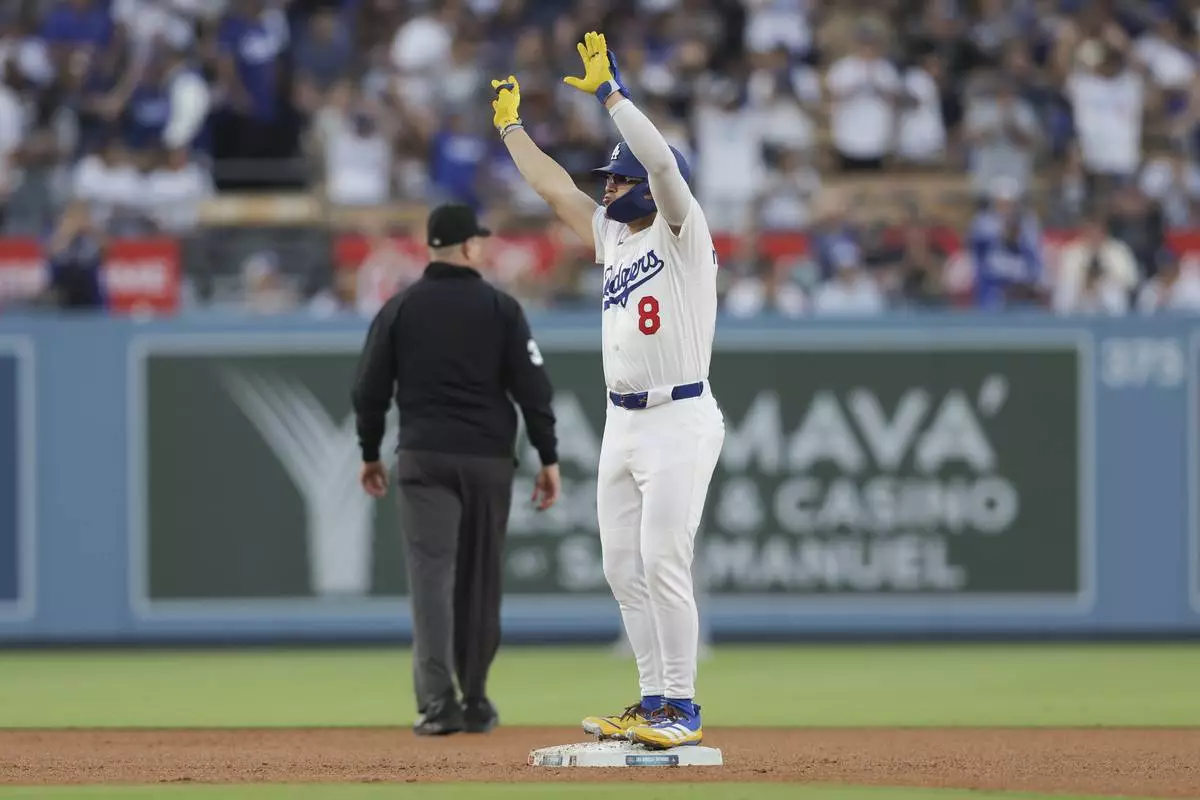 Los Angeles Dodgers' Enrique Hernández gestures after hitting a double during the third inning of a baseball game against the Washington Nationals in Los Angeles, Friday, June 20, 2025. (AP Photo/Jessie Alcheh)