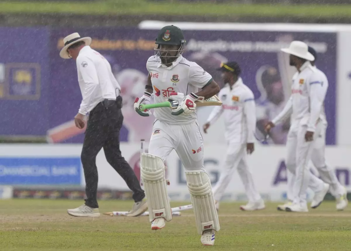 Bangladesh's Mushfiqur Rahim leaves the ground after losing his wicket during the fifth day of the first cricket test match between Sri Lanka and Bangladesh in Galle, Sri Lanka, Saturday, June 21, 2025. (AP Photo/Eranga Jayawardena)