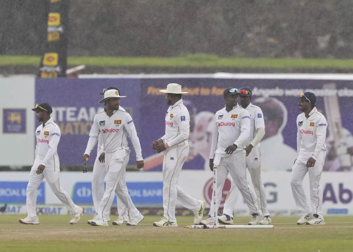 Sri Lanka's team members walk off the field as it rains during the fifth day of the first cricket test match between Sri Lanka and Bangladesh in Galle, Sri Lanka, Saturday, June 21, 2025. (AP Photo/Eranga Jayawardena)