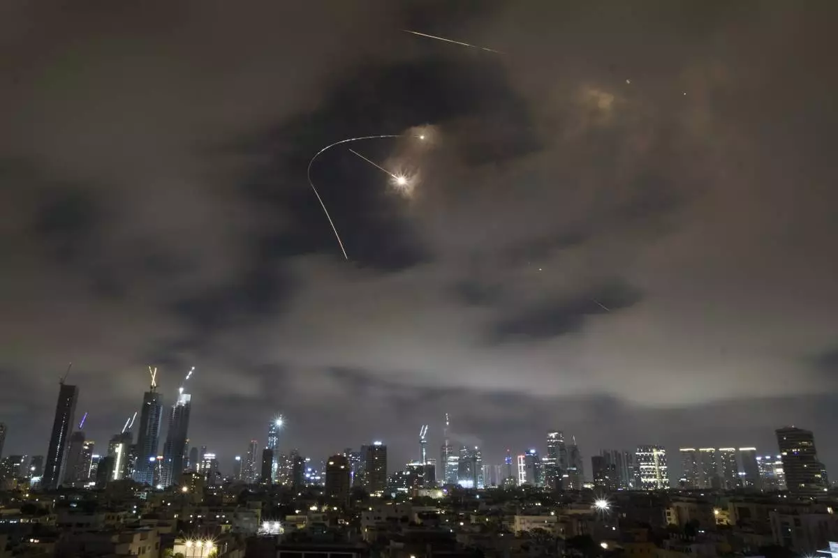 Israeli air defense system fires to intercept missiles during an Iranian attack over Tel Aviv, Israel, Saturday, June 21, 2025. (AP Photo/Leo Correa)