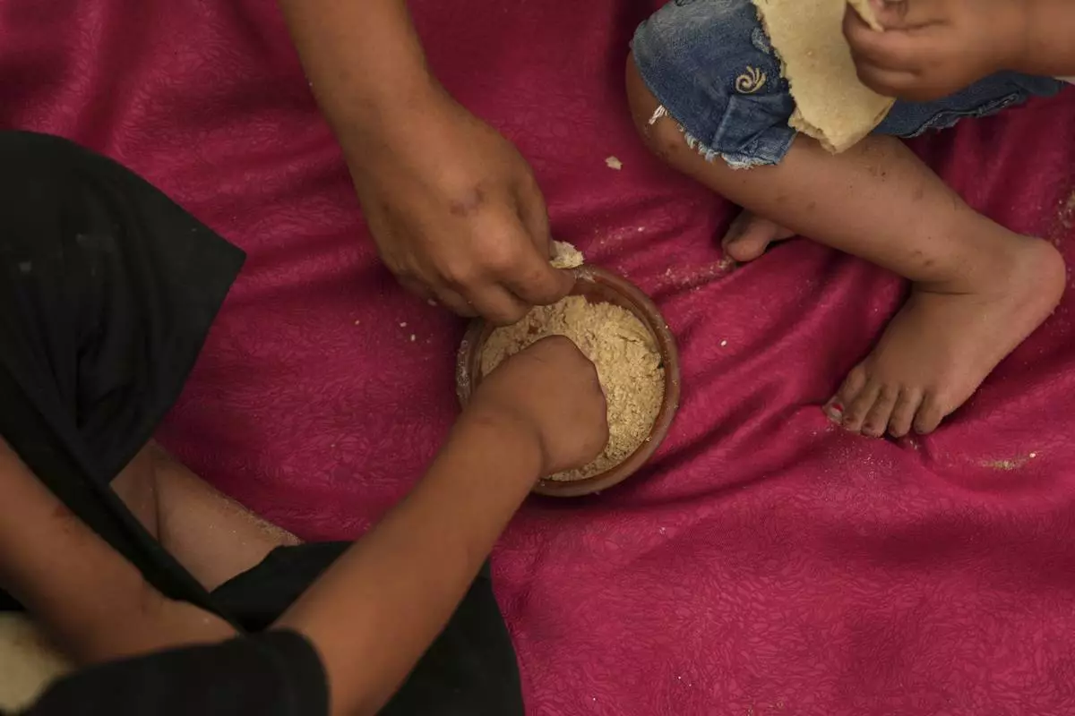 The children of Jamil Atili, 51, eat ground lentils after their father returned empty-handed from an attempt to collect donated food at a distribution center run by private contractor the Gaza Humanitarian Foundation in the southern Gaza Strip, in Khan Younis, Wednesday, June 11, 2025. (AP Photo/Abdel Kareem Hana)
