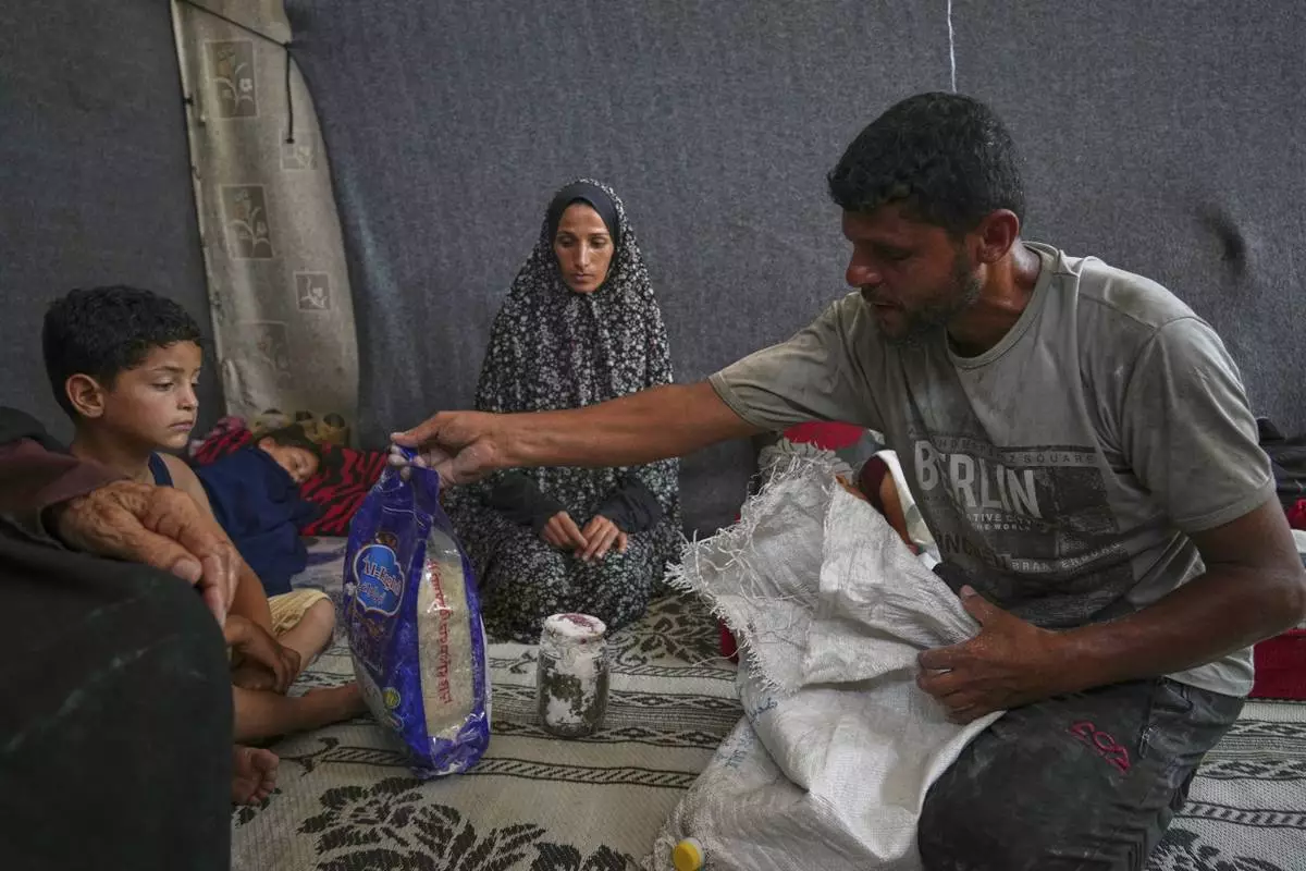 Omar al-Hobi, 43, from Rafah, unpacks a bag of food he collected at a distribution center run by private contractor the Gaza Humanitarian Foundation in the southern Gaza Strip, as he arrives at his family's tent in Khan Younis, Tuesday, June 10, 2025. At left are his children and his wife, Anwaar Saleh.(AP Photo/Abdel Kareem Hana)