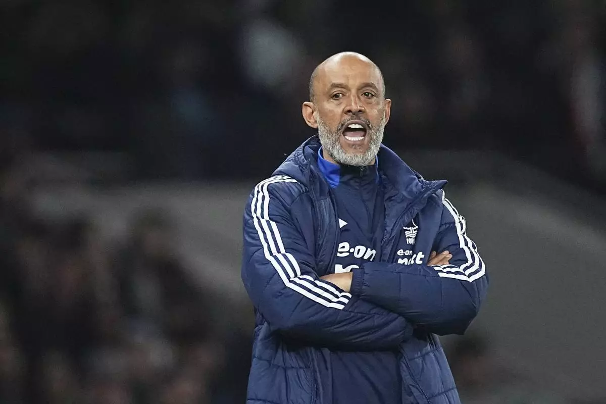 FILE - Nottingham Forest's head coach Nuno Espirito Santo reacts during the English Premier League soccer match between Tottenham and Nottingham Forest at Tottenham Hotspur Stadium in London, Monday, April 21, 2025. (AP Photo/Dave Shopland, File)