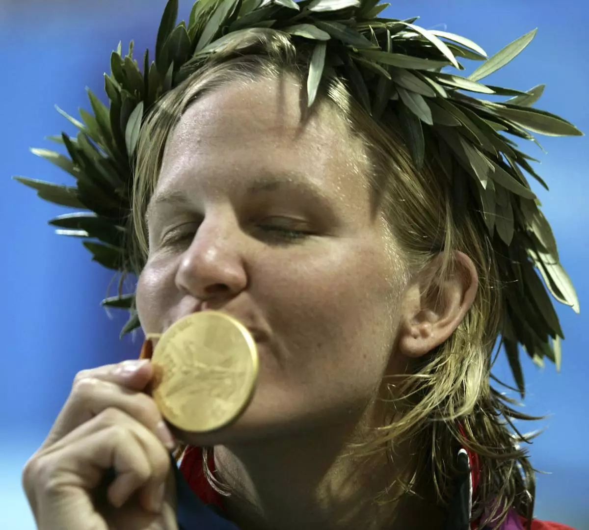 FILE -Kirsty Coventry, of Zimbabwe, kisses her gold medal after winning the 200-meter backstroke at the Olympic Aquatic Centre during the 2004 Olympic Games in Athens, Aug. 20, 2004. (AP Photo/Mark Baker), File)