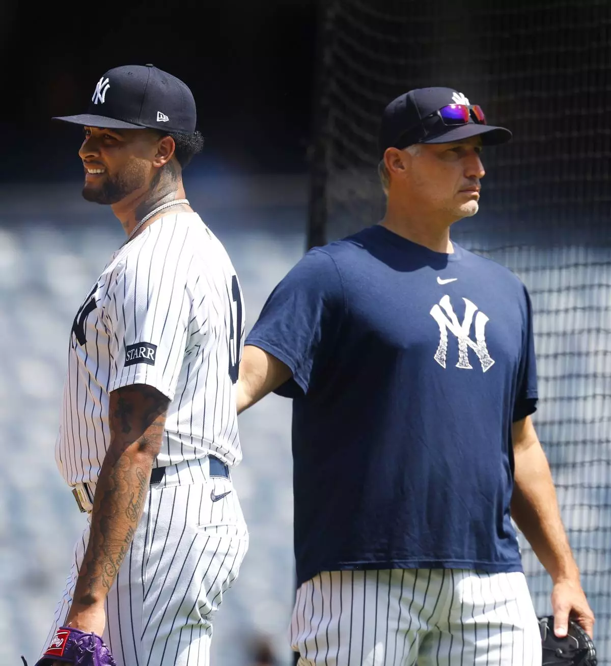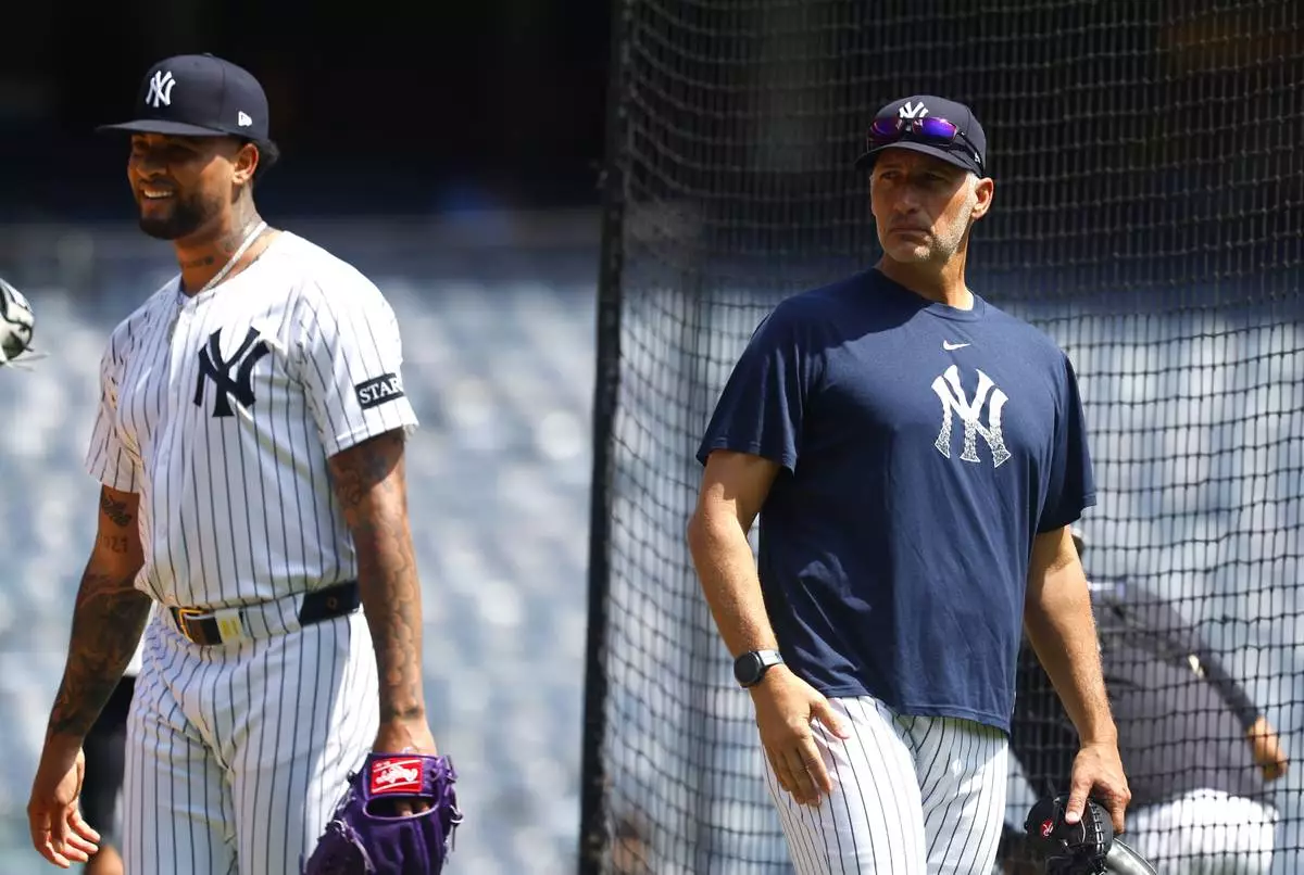 New York Yankees' Luis Gil, left, and Andy Pettitte, right, are on the field during live batting practice before a baseball game between the New York Yankees and the Baltimore Orioles, Saturday, June 21, 2025, in New York. (AP Photo/Noah K. Murray)