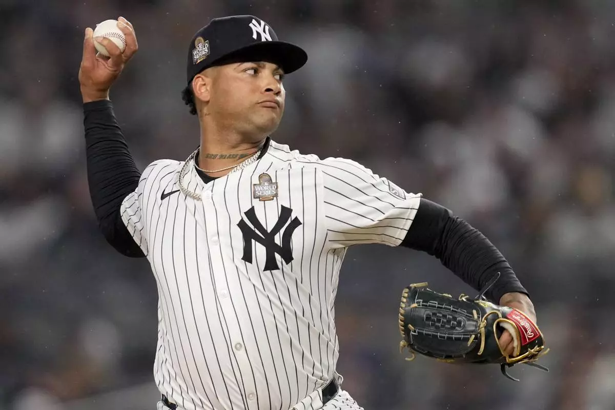 FILE - New York Yankees pitcher Luis Gil throws against the Los Angeles Dodgers during the first inning in Game 4 of the baseball World Series, Tuesday, Oct. 29, 2024, in New York. (AP Photo/Ashley Landis, File)