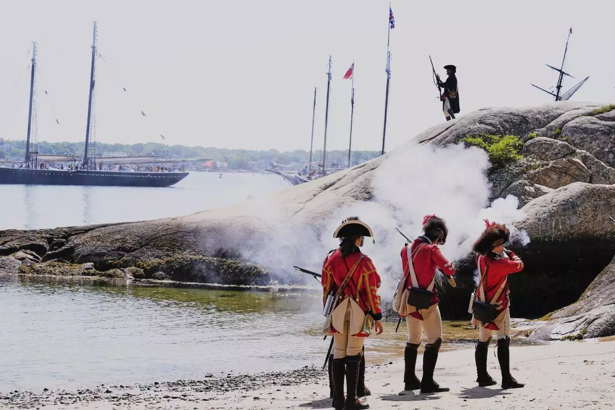 British soldiers on the beach engage a Colonial soldier during a reenactment in celebration of the 250th anniversary of the Battle of Bunker Hill, Saturday, June 21, 2025, in Gloucester, Mass. (AP Photo/Charles Krupa)