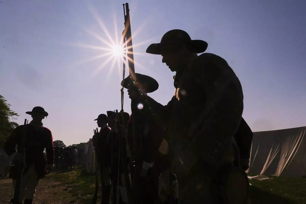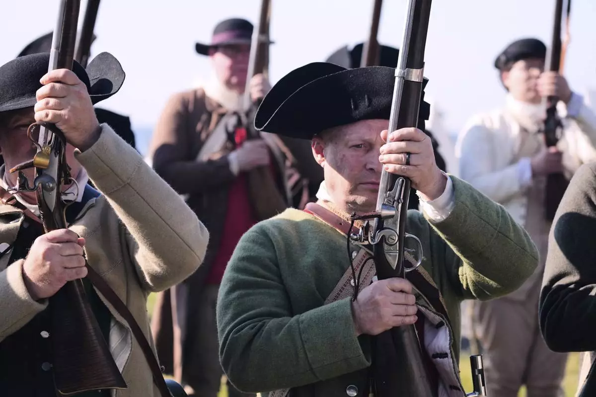 Colonial soldiers prepare to face the British during a reenactment in celebration of the 250th anniversary of the Battle of Bunker Hill, Saturday, June 21, 2025, in Gloucester, Mass. (AP Photo/Charles Krupa)