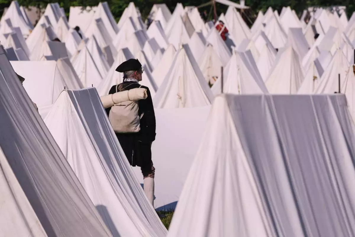 Ed Knight, of Manchester, Vt., who portrays a Colonial soldier, stands among the encampment tents during a reenactment in celebration of the 250th anniversary of the Battle of Bunker Hill, Saturday, June 21, 2025, in Gloucester, Mass. (AP Photo/Charles Krupa)