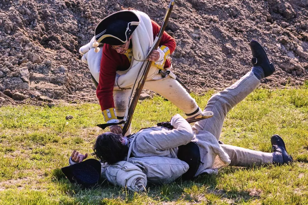 A Colonial soldier is knocked to the ground by a British soldier during a reenactment in celebration of the 250th anniversary of the Battle of Bunker Hill, Saturday, June 21, 2025, in Gloucester, Mass. (AP Photo/Charles Krupa)