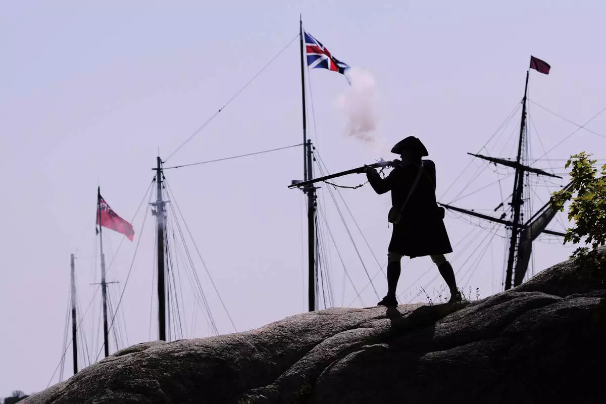 A Colonial soldier fires on the British during a reenactment in celebration of the 250th anniversary of the Battle of Bunker Hill, Saturday, June 21, 2025, in Gloucester, Mass. (AP Photo/Charles Krupa)