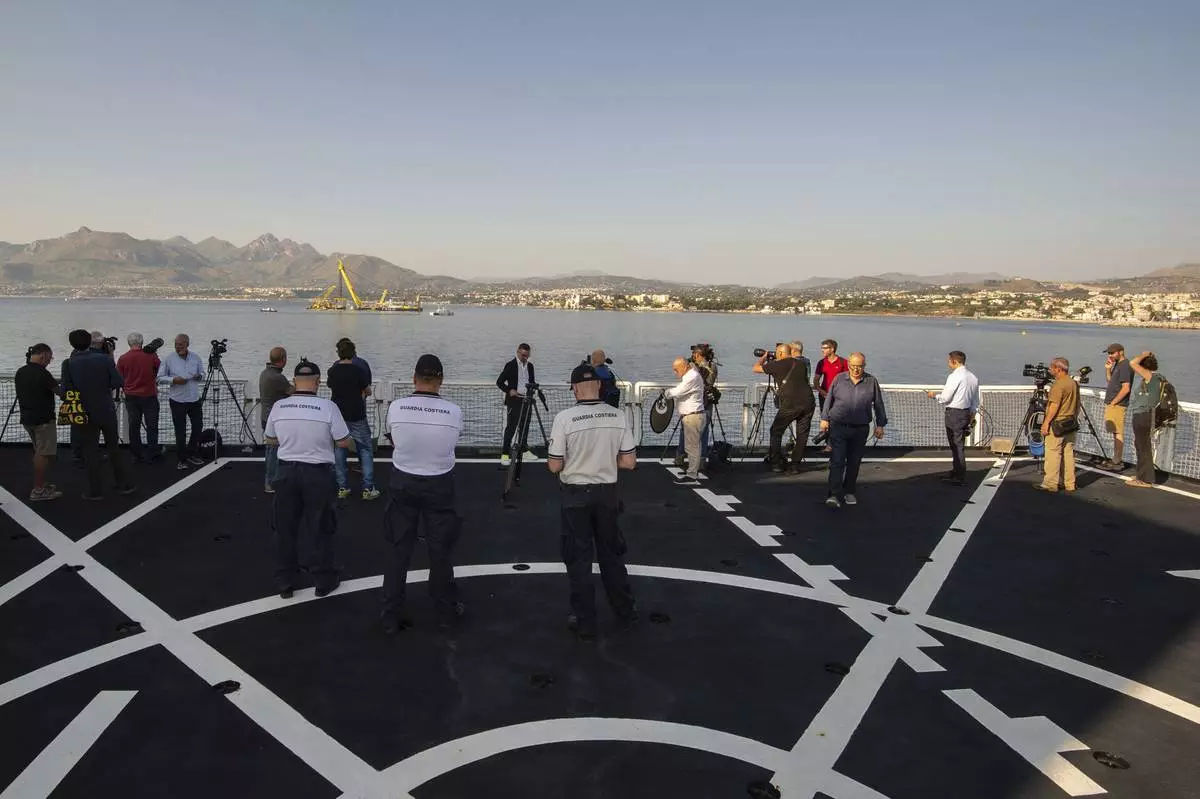 Memebers of the media on the Italian Coast Guard ship 'Dattilo' watch the hull of the superyacht Bayesian, which sank near Palermo, Sicily, on August 19, 2024, being pulled out of the sea and dewatered off the village of Porticello Saturday, June 21, 2025. (AP Photo/Salvatore Cavalli)