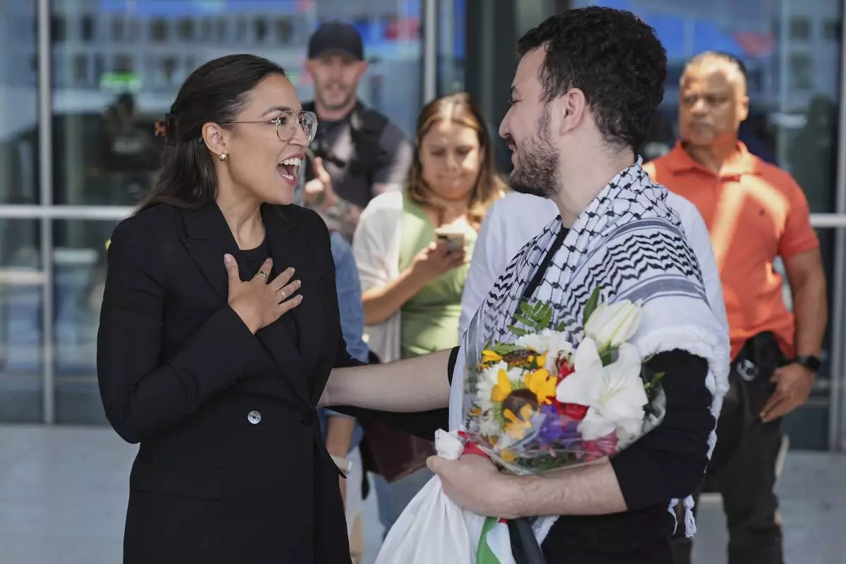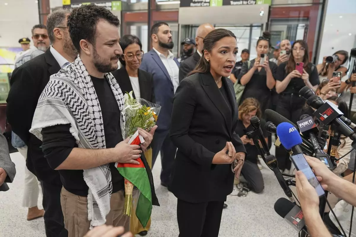 Rep. Alexandria Ocasio-Cortez, D-N.Y., speaks during a news conference after Mahmoud Khalil, left, arrived at Newark International Airport, Saturday, June 21, 2025, in Newark, N.J. (AP Photo/Seth Wenig)