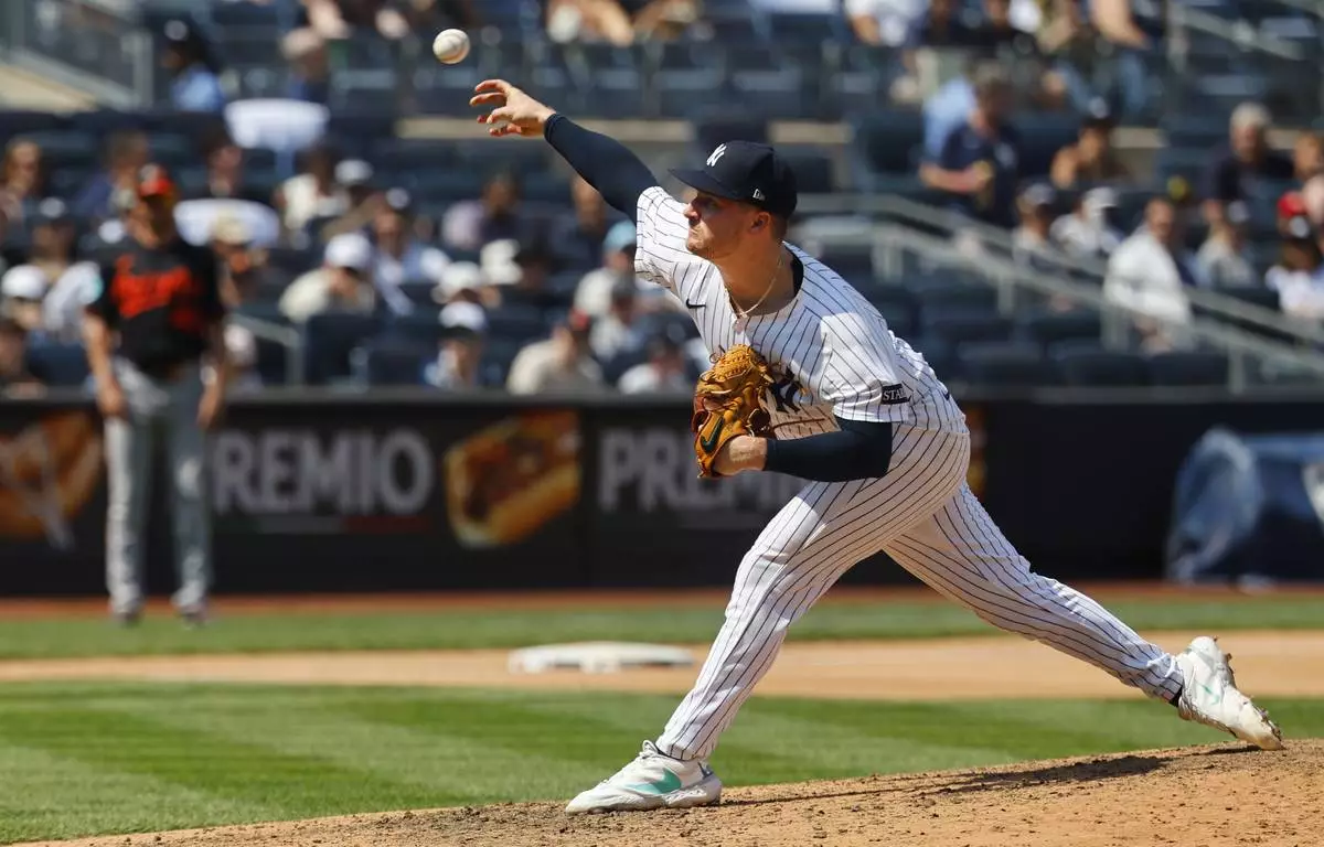New York Yankees pitcher Clarke Schmidt throws during the seventh inning of a baseball game against the Baltimore Orioles, Saturday, June 21, 2025, in New York. (AP Photo/Noah K. Murray)