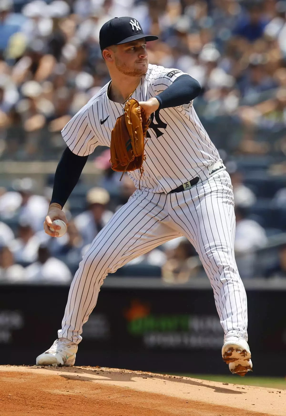 New York Yankees pitcher Clarke Schmidt (36) throws during the first inning of a baseball game against the Baltimore Orioles, Saturday, June 21, 2025, in New York. (AP Photo/Noah K. Murray)