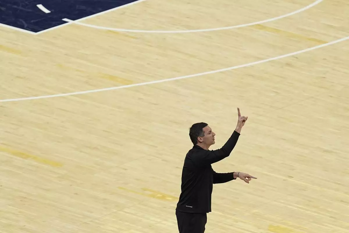 Oklahoma City Thunder head coach Mark Daigneault make a call during the first half of Game 6 of the NBA Finals basketball series against the Indiana Pacers, Thursday, June 19, 2025, in Indianapolis. (AP Photo/Abbie Parr)