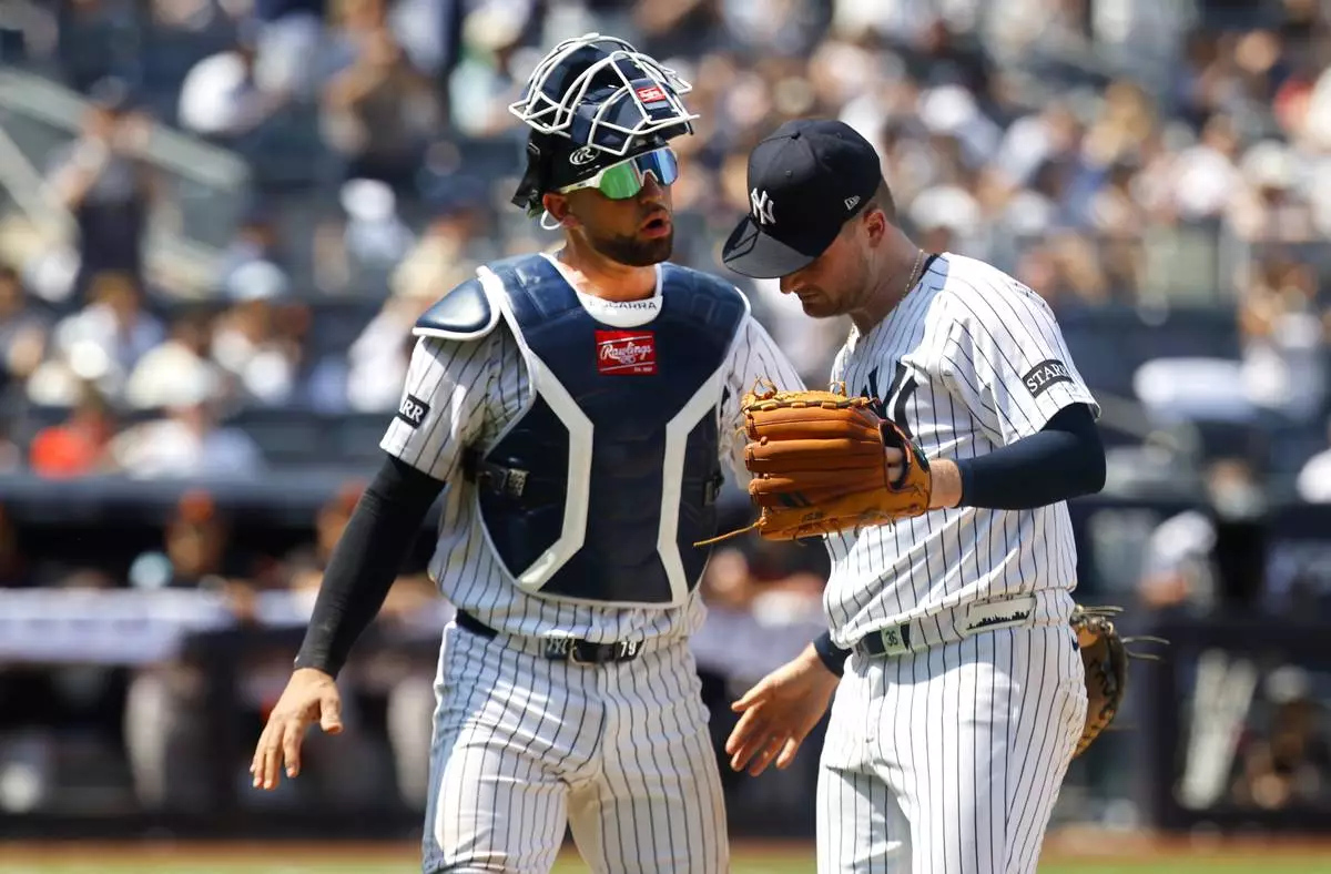 New York Yankees catcher J.C. Escarra and pitcher Clarke Schmidt chat during the seventh inning of a baseball game against the Baltimore Orioles, Saturday, June 21, 2025, in New York. (AP Photo/Noah K. Murray)
