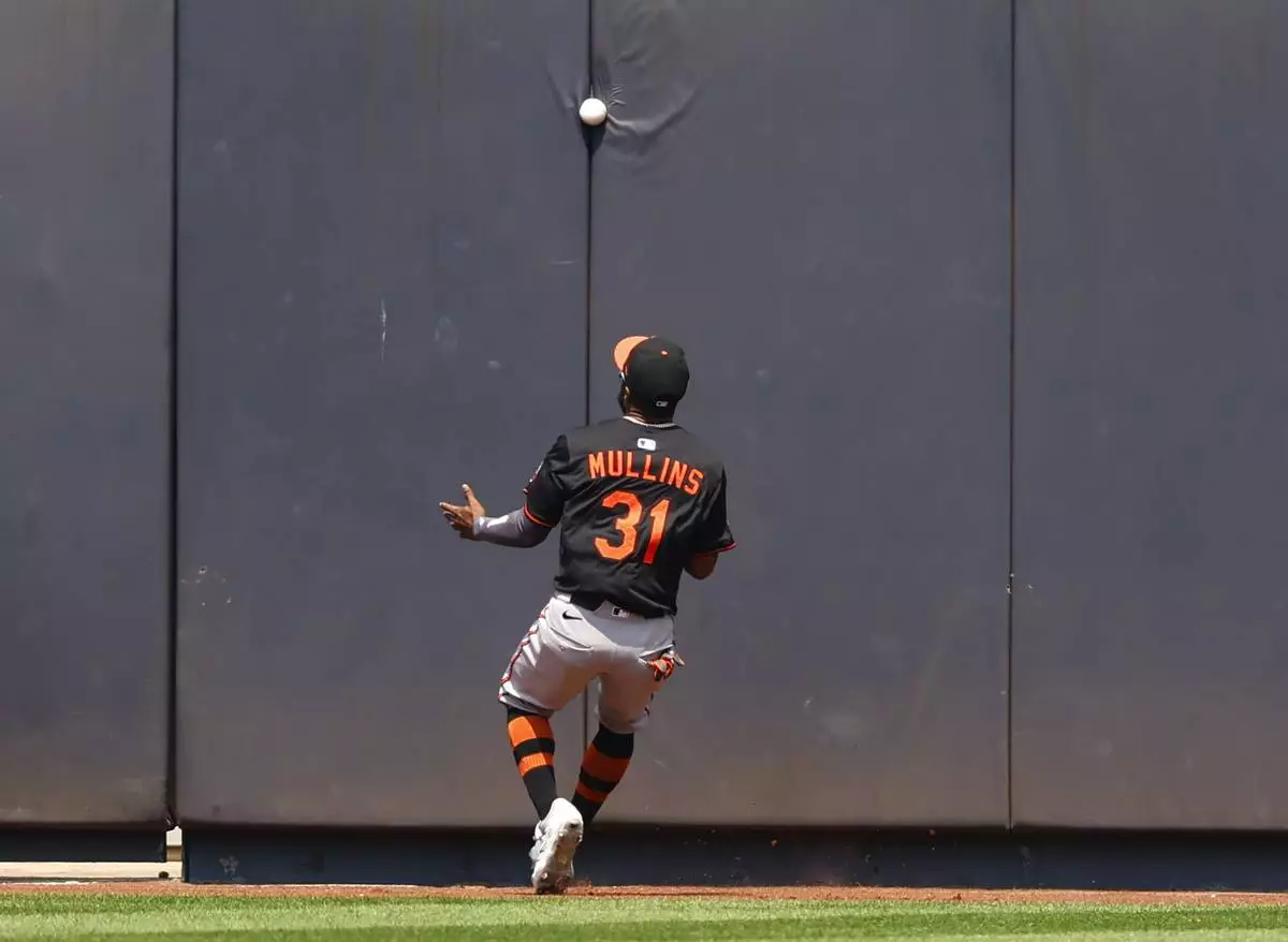 Baltimore Orioles outfielder Cedric Mullins (31) misses a ball hit by New York Yankees' Ben Rice during the fifth inning of a baseball game, Saturday, June 21, 2025, in New York. (AP Photo/Noah K. Murray)