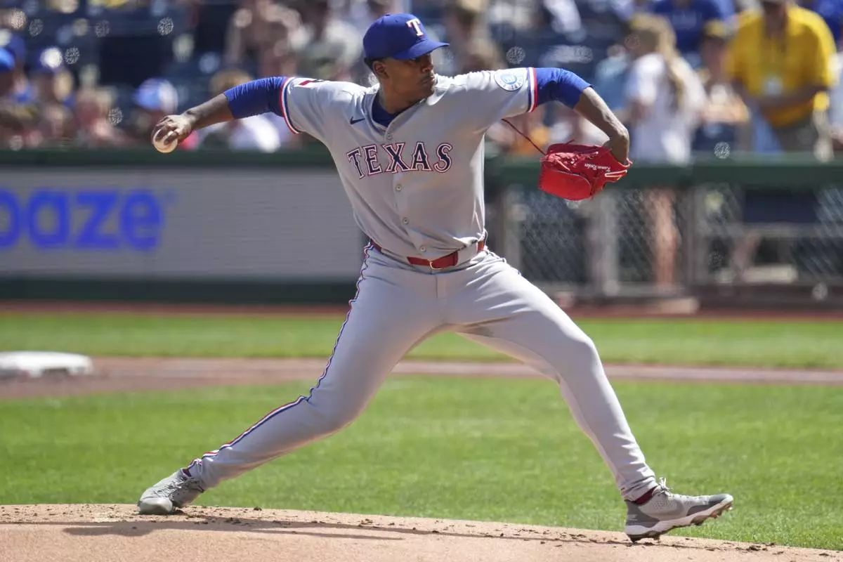 Texas Rangers pitcher Kumar Rocker delivers during the first inning of a baseball game against the Pittsburgh Pirates in Pittsburgh, Saturday, June 21, 2025. (AP Photo/Gene J. Puskar)