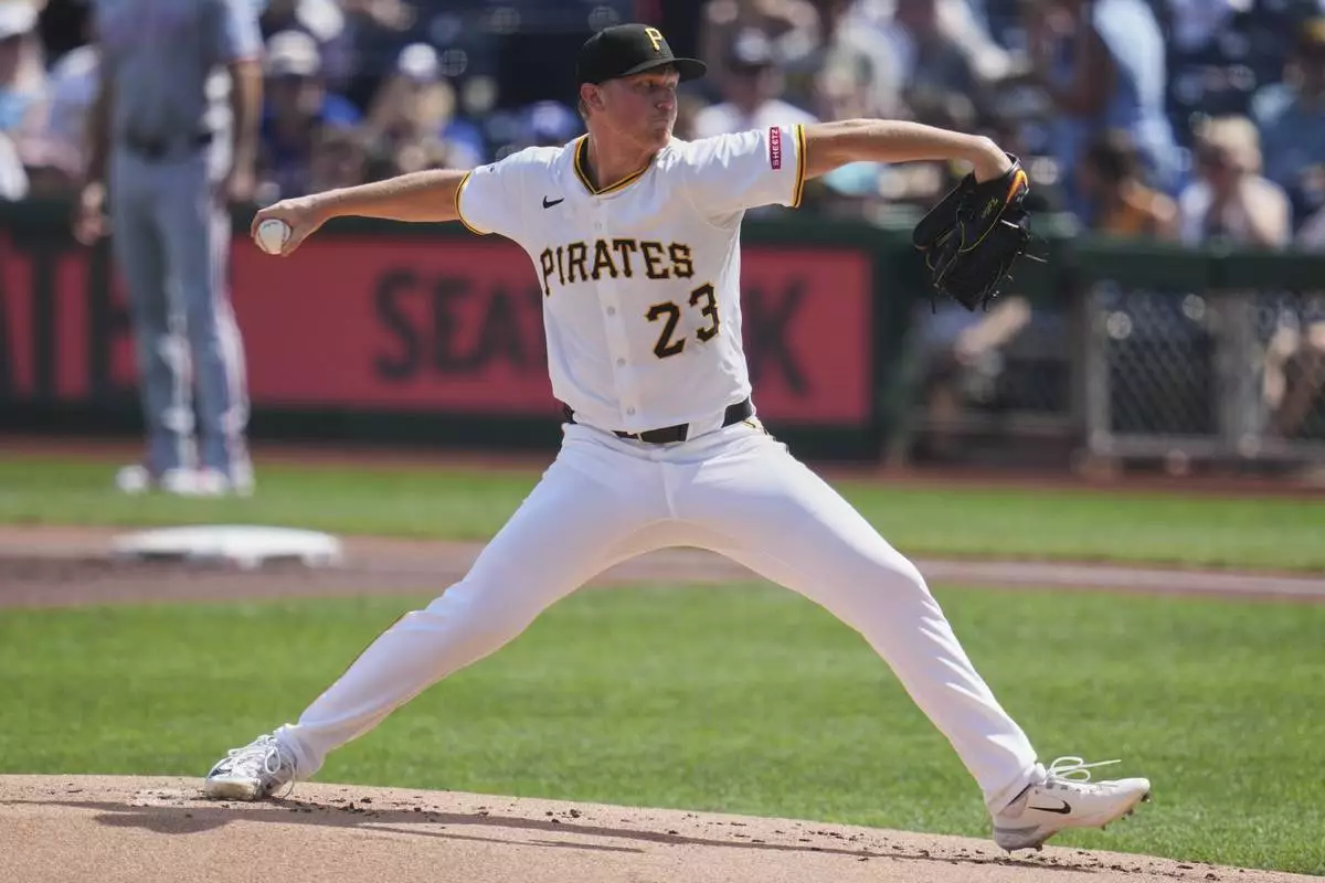 Pittsburgh Pirates pitcher Mitch Keller delivers during the first inning of a baseball game against the Texas Rangers in Pittsburgh, Saturday, June 21, 2025. (AP Photo/Gene J. Puskar)