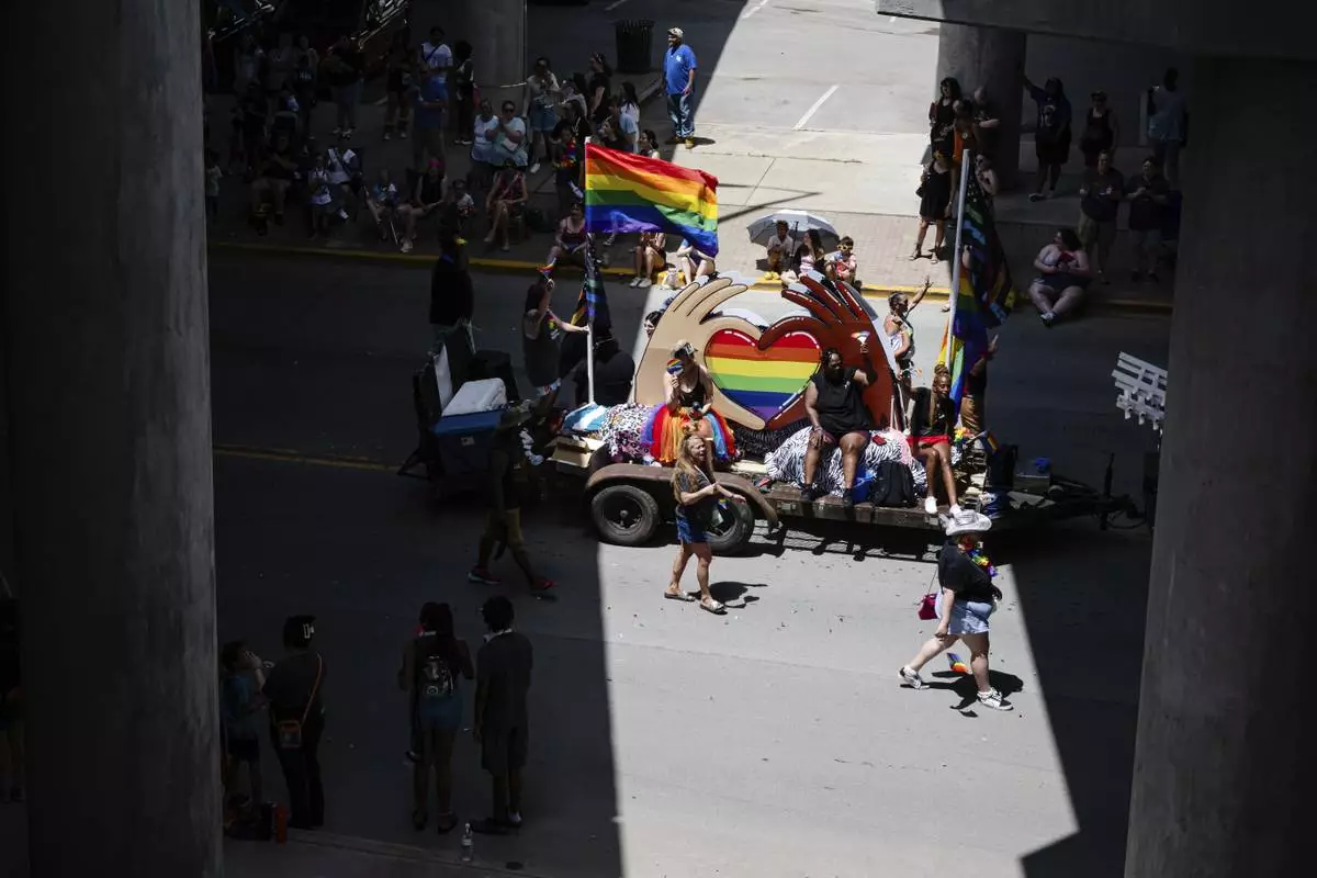 A float passes under an overpass during the Kentuckiana Pride Parade on Saturday, June 21, 2025, in Louisville, Ky. (AP Photo/Jon Cherry)