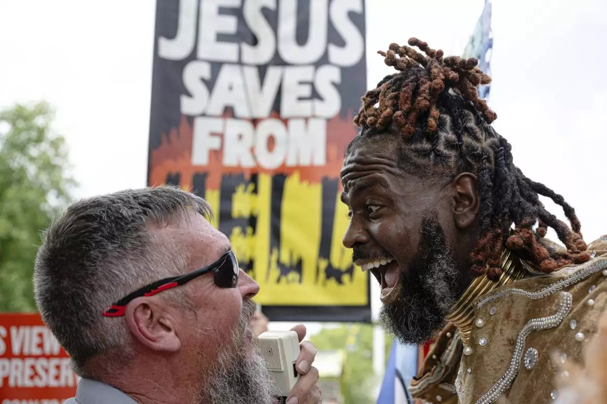 A parade attendee shouts at a Christian protester during the Kentuckiana Pride Parade on Saturday, June 21, 2025, in Louisville, Ky. (AP Photo/Jon Cherry)
