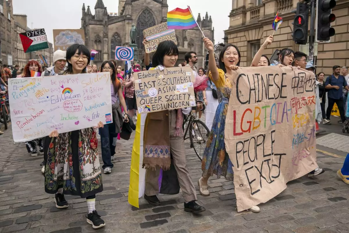 People take part in the Pride Edinburgh 2025 parade through Edinburgh city center, Scotland, Saturday June 21, 2025. (Jane Barlow/PA via AP)