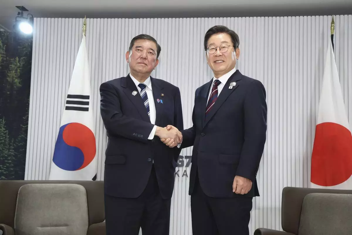Japanese Prime Minister Shigeru Ishiba, left, and South Korean President Lee Jae Myung, right, shake hands ahead of a bilateral meeting on the sidelines of the G7, in Kananaskis, Alberta, on June 17, 2025. (Kyodo News via AP)