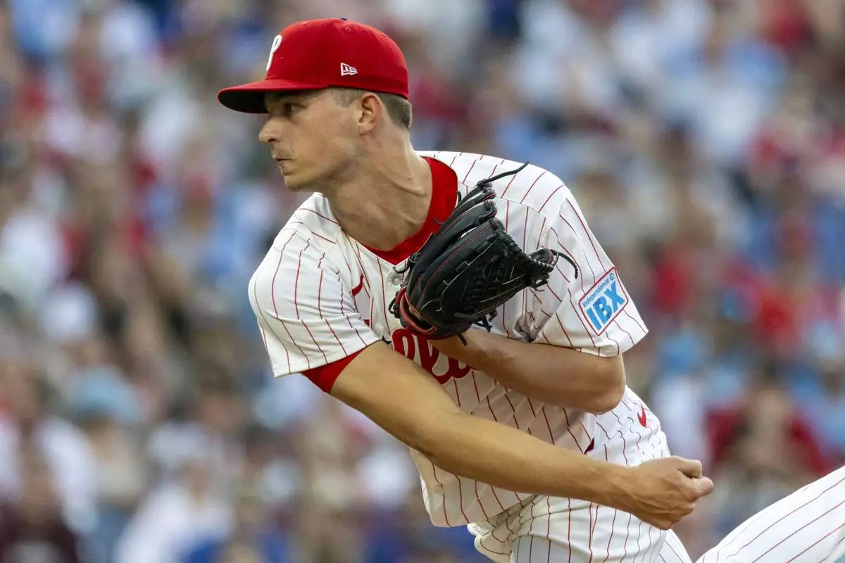 Philadelphia Phillies starting pitcher Mick Abel throws during the first inning of a baseball game against the New York Mets, Saturday, June 21, 2025, in Philadelphia. (AP Photo/Laurence Kesterson)