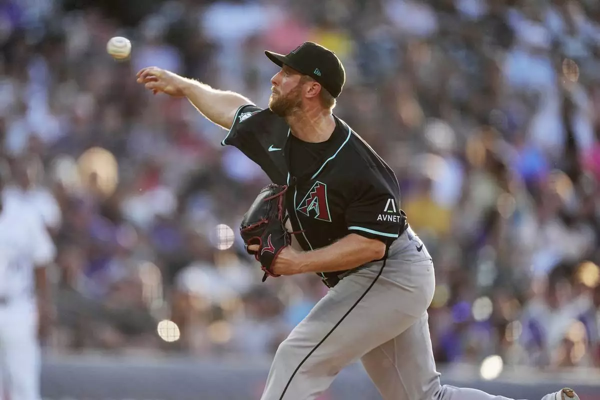 Arizona Diamondbacks starting pitcher Merrill Kelly works against the Colorado Rockies in the first inning of a baseball game Saturday, June 21, 2025, in Denver. (AP Photo/David Zalubowski)