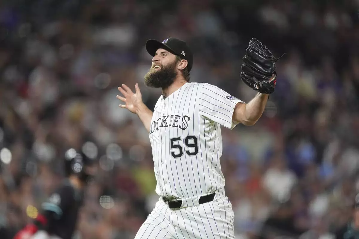 Colorado Rockies relief pitcher Jake Bird reacts after striking out Arizona Diamondbacks' Tim Tawa to end the top of the eighth inning of a baseball game Saturday, June 21, 2025, in Denver. (AP Photo/David Zalubowski)