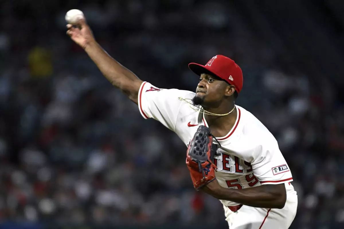 Los Angeles Angels pitcher José Soriano throws against the Houston Astros in the seventh inning of a baseball game Saturday, June 21, 2025, in Anaheim, Calif. (AP Photo/Wally Skalij)