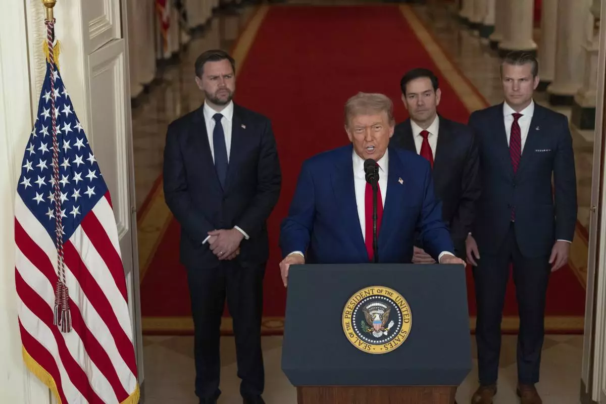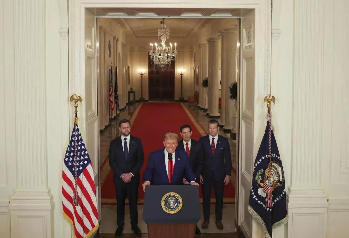 President Donald Trump speaks from the East Room of the White House in Washington, Saturday, June 21, 2025, after the U.S. military struck three Iranian nuclear and military sites, directly joining Israel's effort to decapitate the country's nuclear program, as Vice President JD Vance, Secretary of State Marco Rubio and Defense Secretary Pete Hegseth listen. (Carlos Barria/Pool via AP)