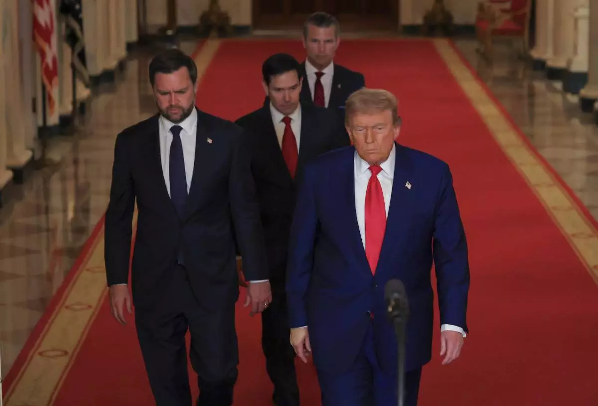 President Donald Trump arrives with Vice President JD Vance, Secretary of State Marco Rubio and Defense Secretary Pete Hegseth to speak from the East Room of the White House in Washington, Saturday, June 21, 2025, after the U.S. military struck three Iranian nuclear and military sites, directly joining Israel's effort to decapitate the country's nuclear program. (Carlos Barria/Pool via AP)
