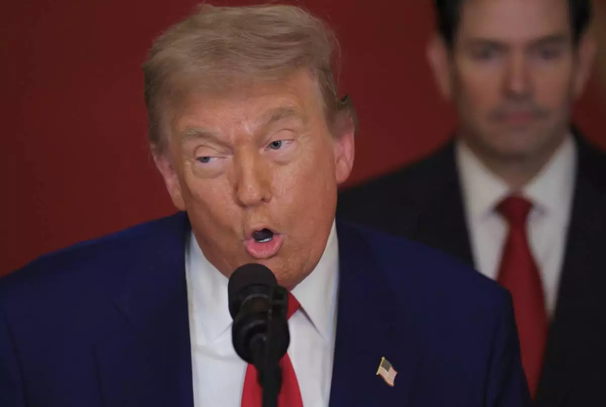 President Donald Trump speaks from the East Room of the White House in Washington, Saturday, June 21, 2025, after the U.S. military struck three Iranian nuclear and military sites, directly joining Israel's effort to decapitate the country's nuclear program, as Secretary of State Marco Rubio listens. (Carlos Barria/Pool via AP)