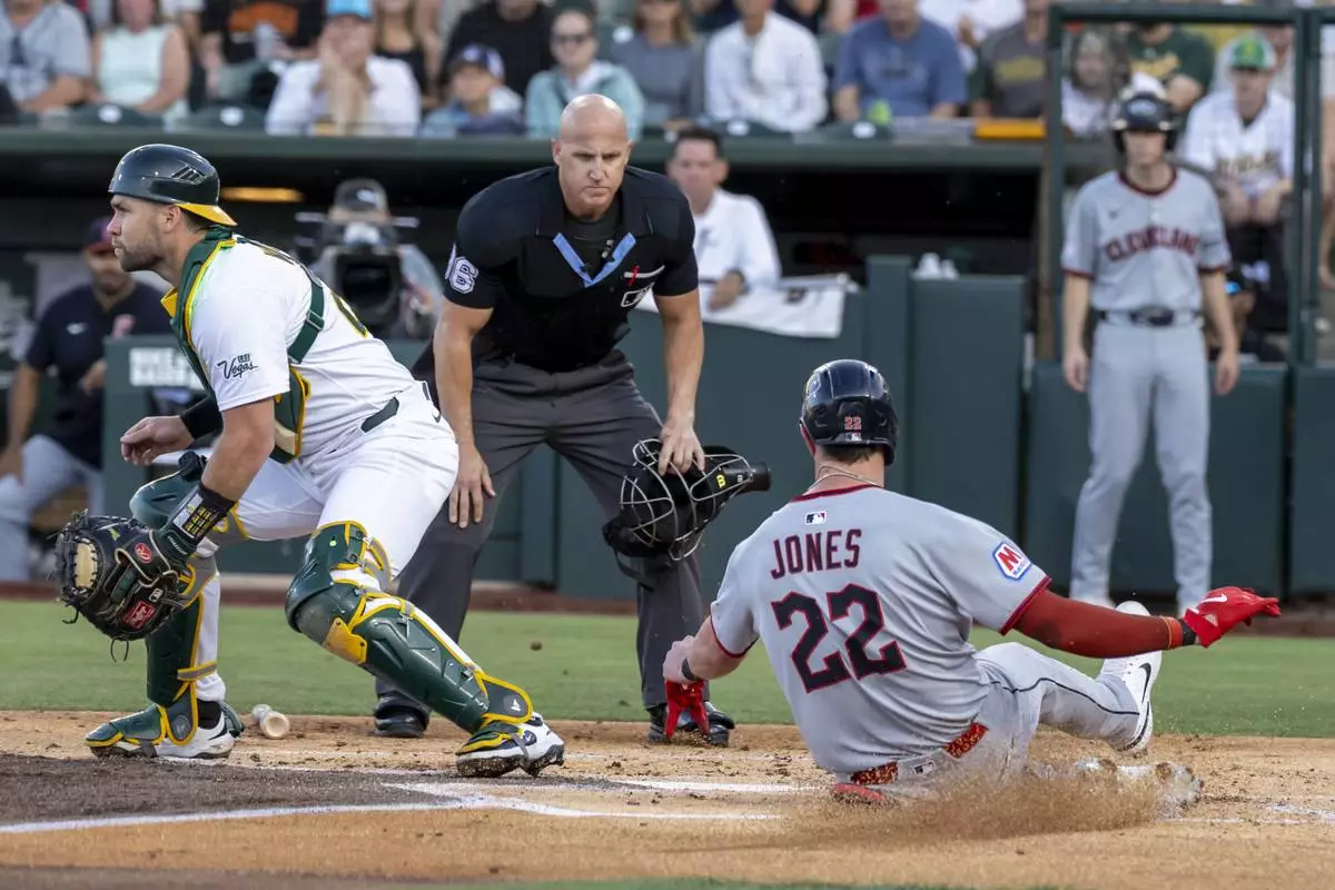 Cleveland Guardians' Nolan Jones (22) scores during the second inning of a baseball game against the Athletics Saturday, June 21, 2025, in West Sacramento, Calif. (AP Photo/Sara Nevis)