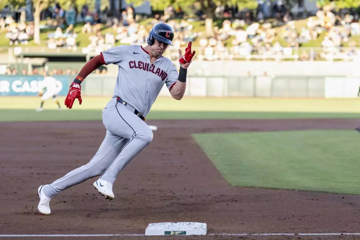 Cleveland Guardians' Nolan Jones rounds third base to score during the second inning of a baseball game against the Athletics Saturday, June 21, 2025, in West Sacramento, Calif. (AP Photo/Sara Nevis)