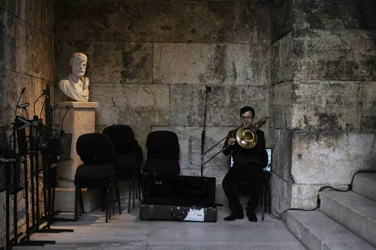 Greek National Opera musician Neoklis Aravantinos plays his bass trombone ahead of Giacomo Puccini's "Turandot" premiere during the 70th Athens Epidaurus Festival at the Odeon of Herodes Atticus in Athens, Greece, Sunday, June 1, 2025. (AP Photo/Thanassis Stavrakis)