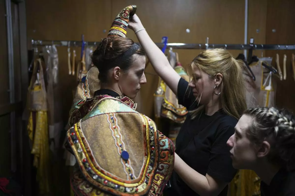 Dancers Anastasia Valsamaki, left, and Antonia Oikonomou, right, prepare ahead of Giacomo Puccini's "Turandot" performance by the Greek National Opera during the 70th Athens Epidaurus Festival at the Odeon of Herodes Atticus in Athens, Greece, Tuesday, June 3, 2025. (AP Photo/Thanassis Stavrakis)