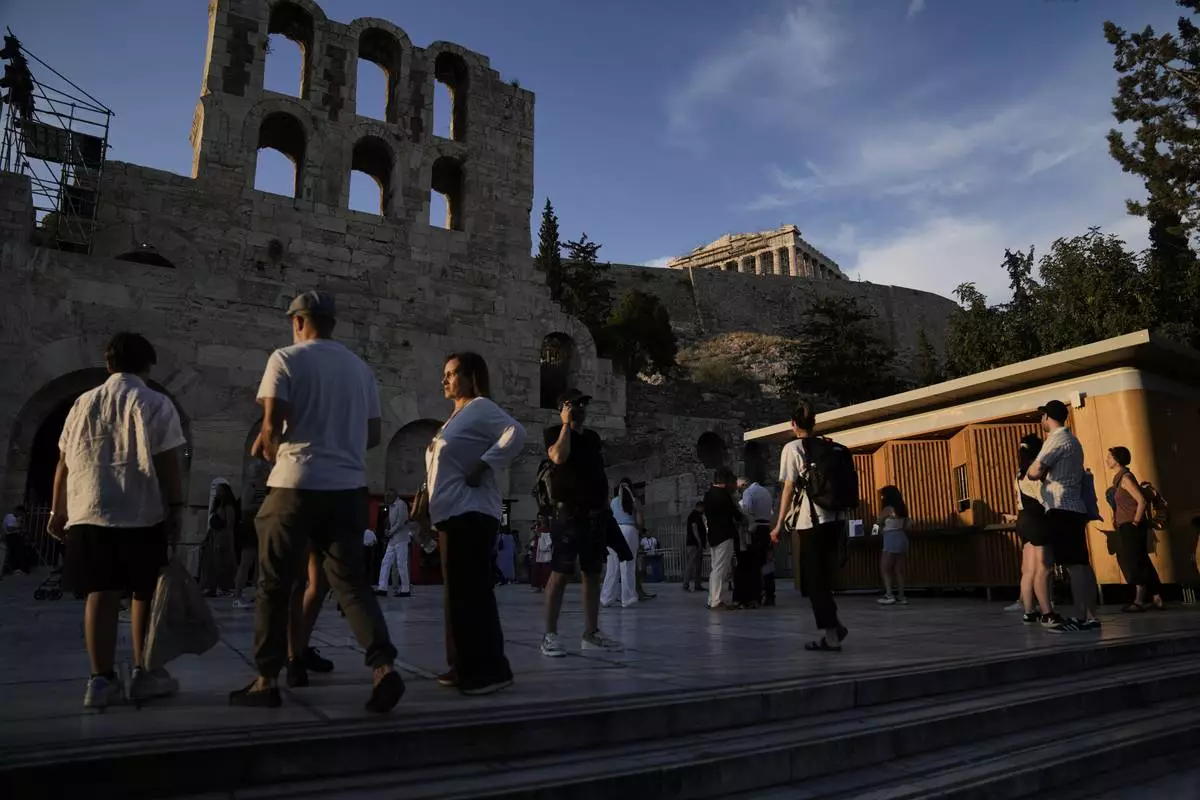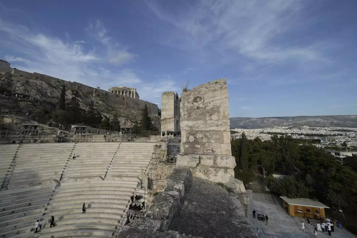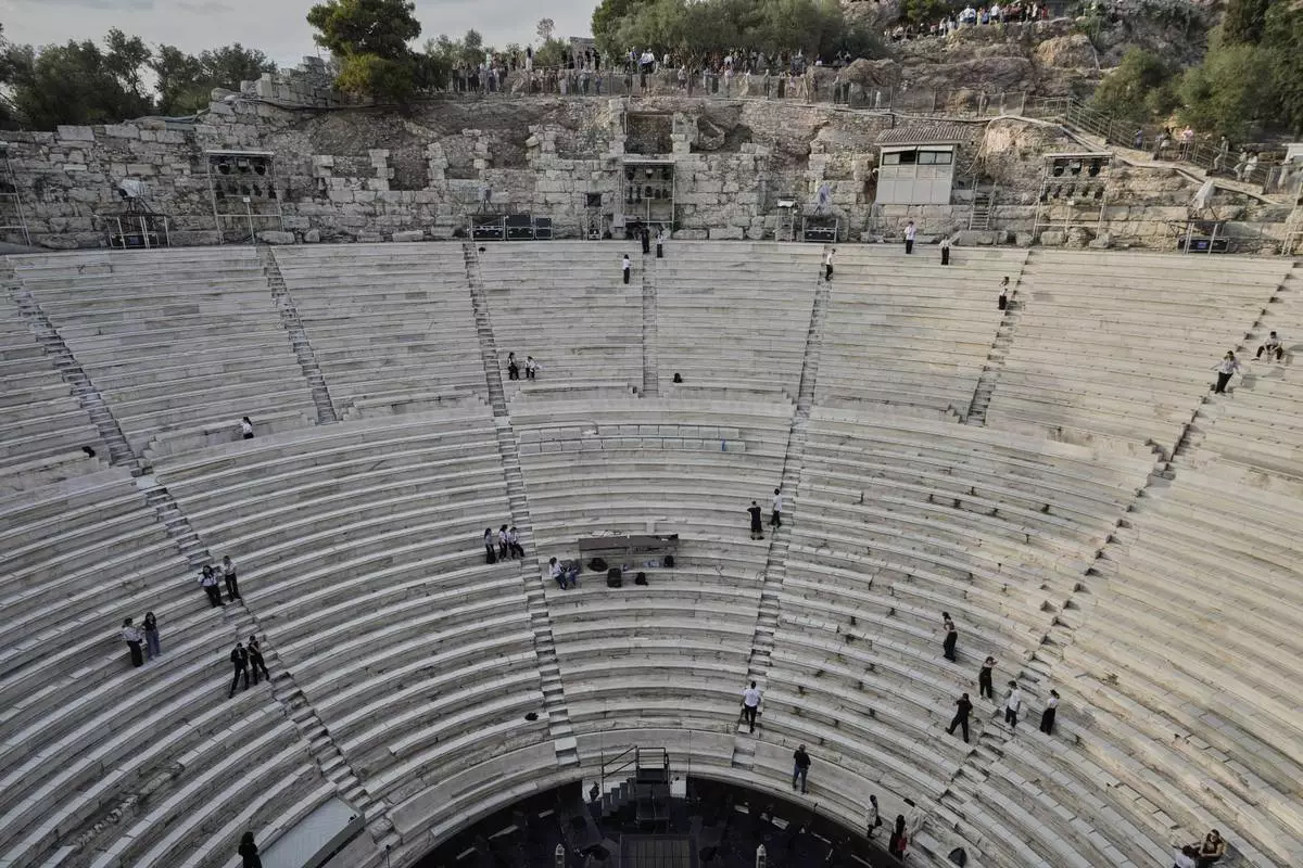 Tourists watch the ushers as they prepare the Odeon of Herodes Atticus ahead of the dress rehearsal of Giacomo Puccini's "Turandot" by the Greek National Opera during the 70th Athens Epidaurus Festival in Athens, Greece, Friday, May 30, 2025. (AP Photo/Thanassis Stavrakis)
