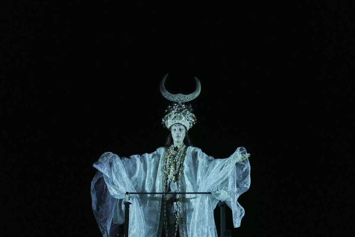 Performer Denia Mimerini of the Greek National Opera plays at Giacomo Puccini's "Turandot" during the 70th Athens Epidaurus Festival at the Odeon of Herodes Atticus in Athens, Greece, Tuesday, June 3, 2025. (AP Photo/Thanassis Stavrakis)