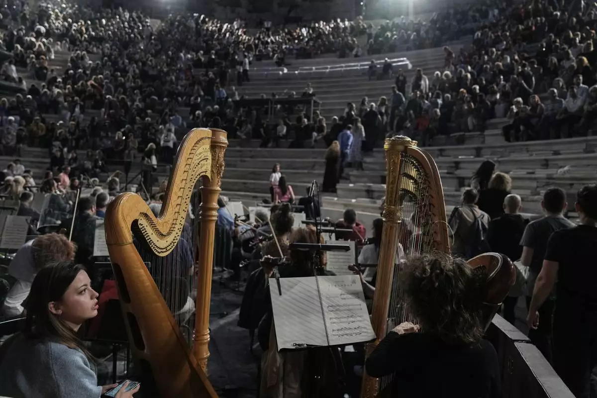 The two harpists of the Greek National Opera Ersilia Mikrou, left, and Anna Dermani watch the spectators taking their seats at the Odeon of Herodes Atticus ahead of Giacomo Puccini's "Turandot" dress rehearsal during the 70th Athens Epidaurus Festival in Athens, Greece, Friday, May 30, 2025. (AP Photo/Thanassis Stavrakis)
