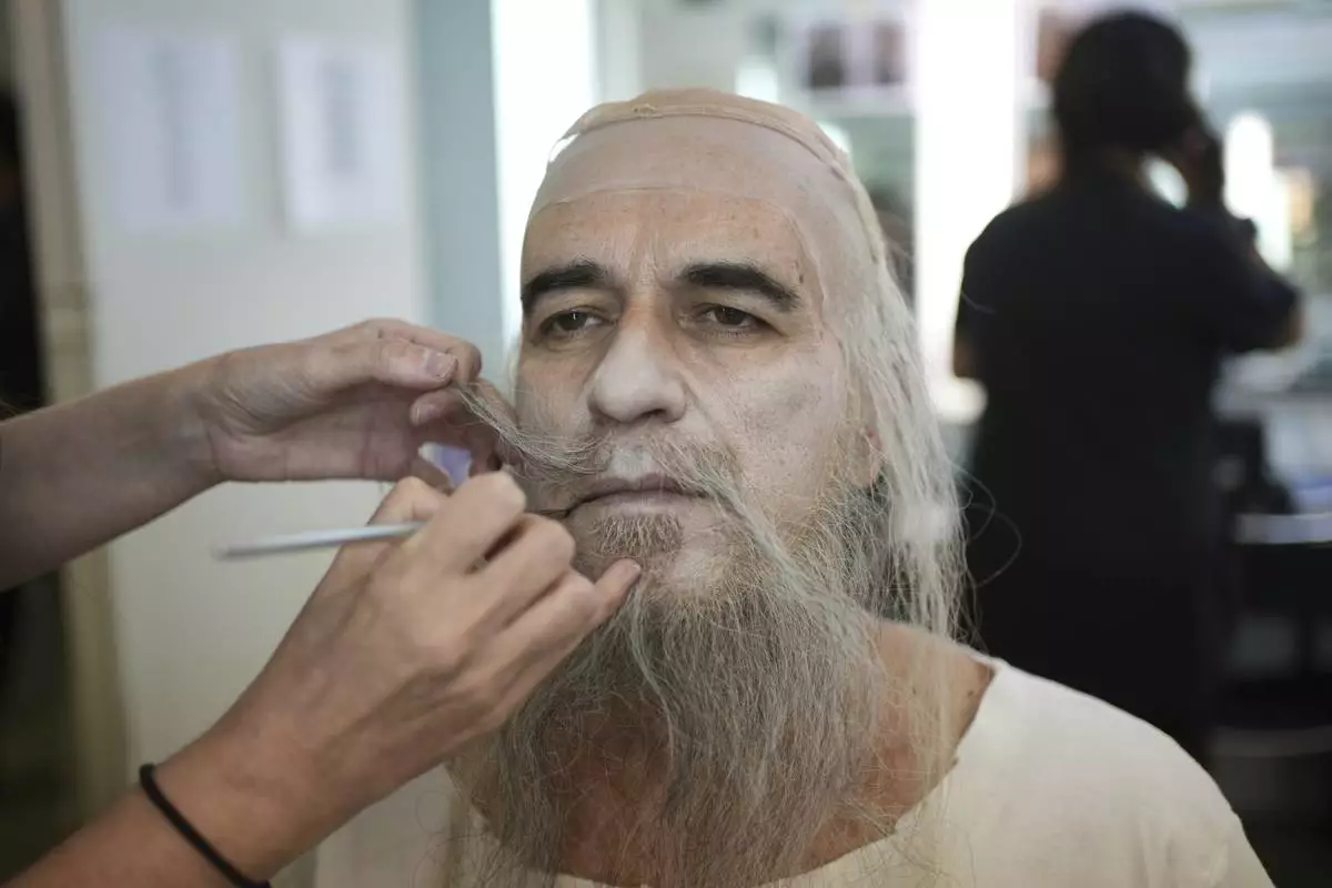 Tenor Nikos Stefanou gets his make-up ahead of Giacomo Puccini's "Turandot" performance during the 70th Athens Epidaurus Festival at the Odeon of Herodes Atticus in Athens, Greece, Tuesday, June 3, 2025. (AP Photo/Thanassis Stavrakis)