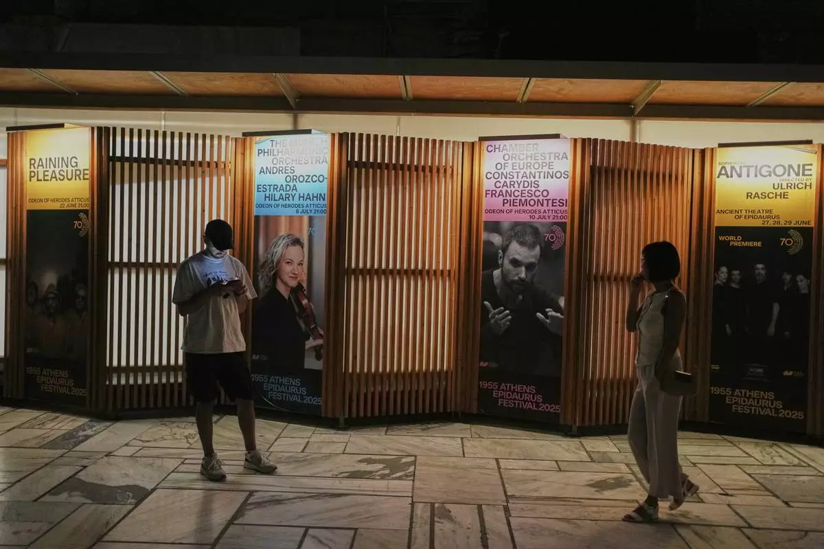 People walk outside the Odeon of Herodes Atticus during Giacomo Puccini's "Turandot" performance by the Greek National Opera part of the 70th Athens Epidaurus Festival in Athens, Greece, Tuesday, June 3, 2025. (AP Photo/Thanassis Stavrakis)