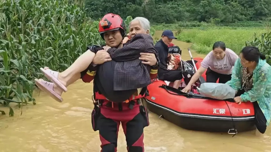 Armed police were deployed in Hechi City, south China's Guangxi Zhuang Autonomous Region, where floodwaters reached up to six meters in some areas, submerging streets and farmland. Rescuers using rubber boats evacuated residents from inundated villages threatened by landslides.