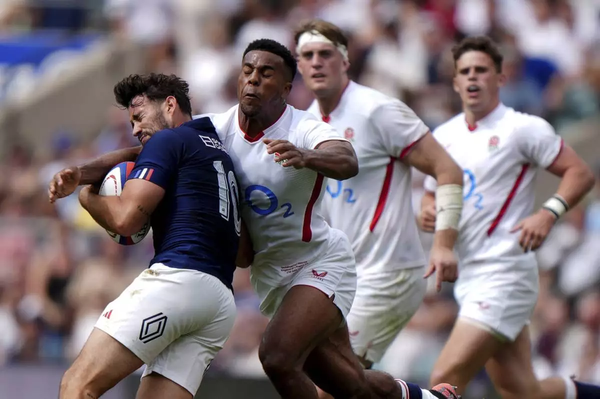 England's Immanuel Feyi-Waboso tackles France's Antoine Hastoy during the international friendly rugby match between England and France at The Allianz Stadium, London, Saturday June 21, 2025. (Bradley Collyer/PA via AP)