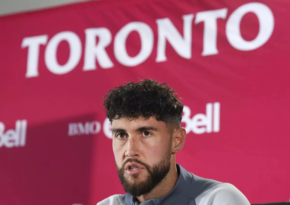 FILE - Jonathan Osorio, midfielder and captain of Toronto FC, speaks to the media during an MLS soccer news conference in Toronto, Oct. 17, 2024. (Nathan Denette/The Canadian Press via AP, File)
