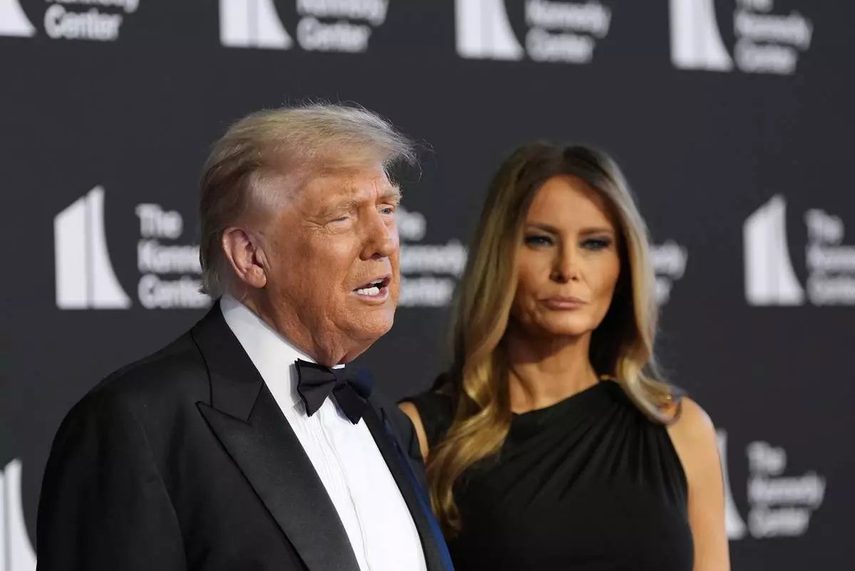 President Donald Trump and first lady Melania Trump arrive to view opening night of "Les Miserables," at the Kennedy Center, Wednesday, June 11, 2025, in Washington. (AP Photo/Alex Brandon)