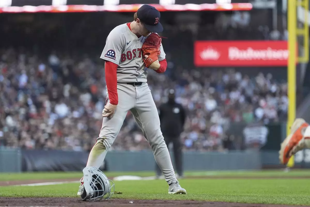 Boston Red Sox pitcher Hunter Dobbins reacts after fielding an infield RBI single by San Francisco Giants' Mike Yastrzemski during the second inning of a baseball game in San Francisco, Friday, June 20, 2025. (AP Photo/Jeff Chiu)