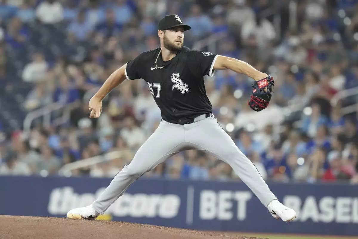 Chicago White Sox pitcher Adrian Houser works against Toronto Blue Jays during the first inning of a baseball game in Toronto, Sunday June 22, 2025. (Chris Young/The Canadian Press via AP)
